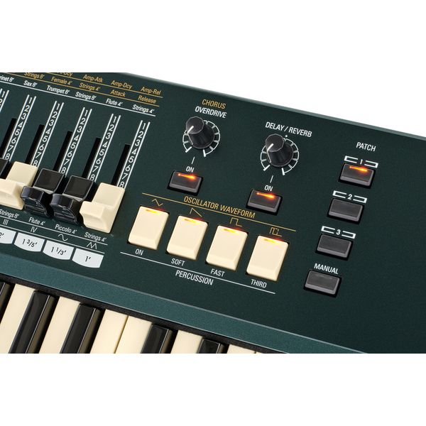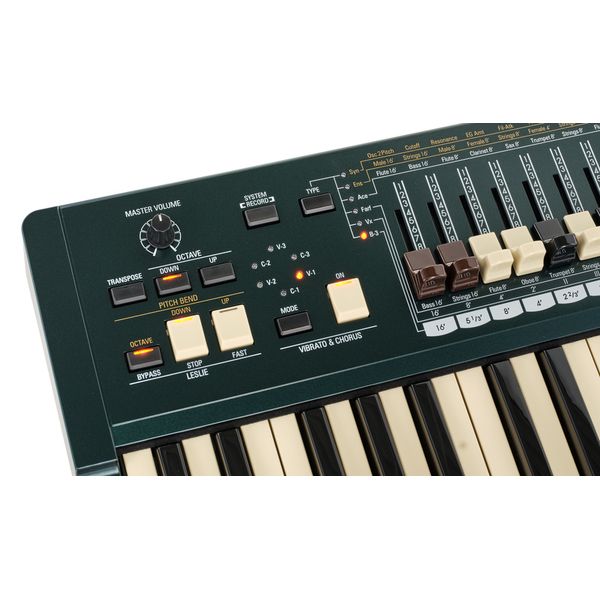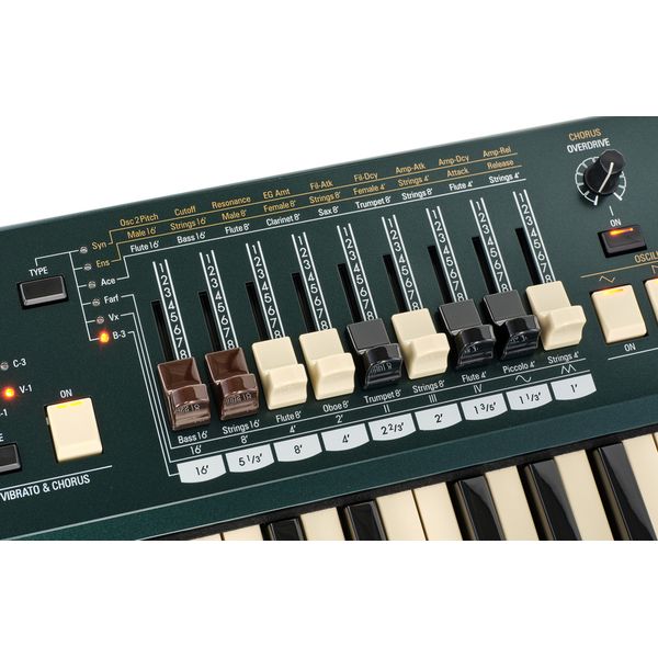Sintetizador órgano Teclado sensible a la velocidad con 49 teclas y 4 octavas Teclado multicontacto virtual 6 secciones de sonido: B-3, Vox, Farfisa, ACE-Tone, Ensemble, Synthesizer Sección de sintetizador con 2 osciladores, filtro de paso bajo con envolvente y envolvente VCA Efecto Leslie virtual V