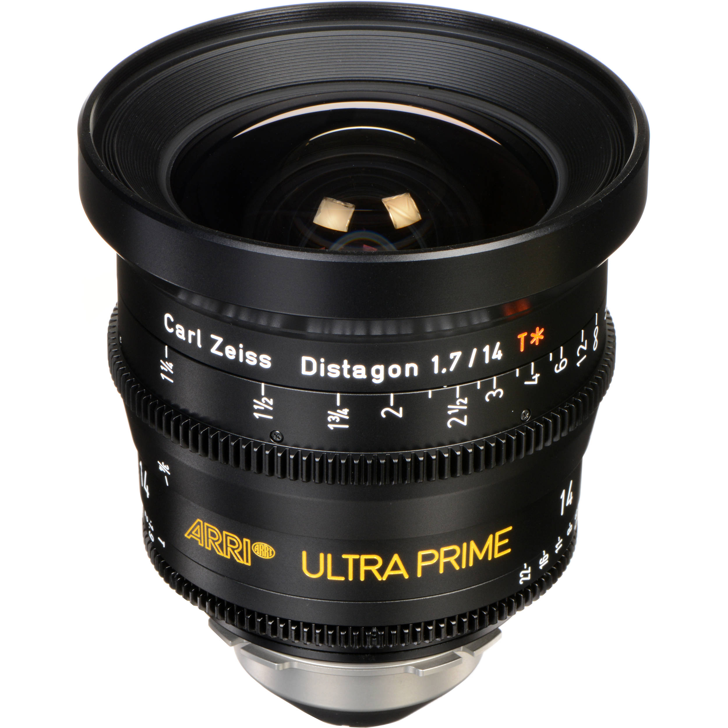 El cilindro del objetivo Ultra Prime de 14 mm está marcado en pies y tiene marcas de enfoque en ambos lados del cilindro, lo que permite que el tirador de enfoque trabaje fácilmente en el lado del objetivo que mejor se adapta a cada configuración. Sus engranajes de iris y enfoque Mod 0.8 estándar de la industria interactúan con unidades de seguimiento de enfoque manual y con motores de control de lentes inalámbricos. Los 15 lentes de la serie Ultra Prime comparten posiciones comunes de enfoque y engranaje del iris, lo que permite cambios rápidos de lentes sin necesidad de reposicionar los accesorios de los lentes. Si bien la mayoría de los Ultra Primes comparten un diámetro de cañón frontal de 95 mm, el gran angular de 14 mm tiene un frente de 114 mm.