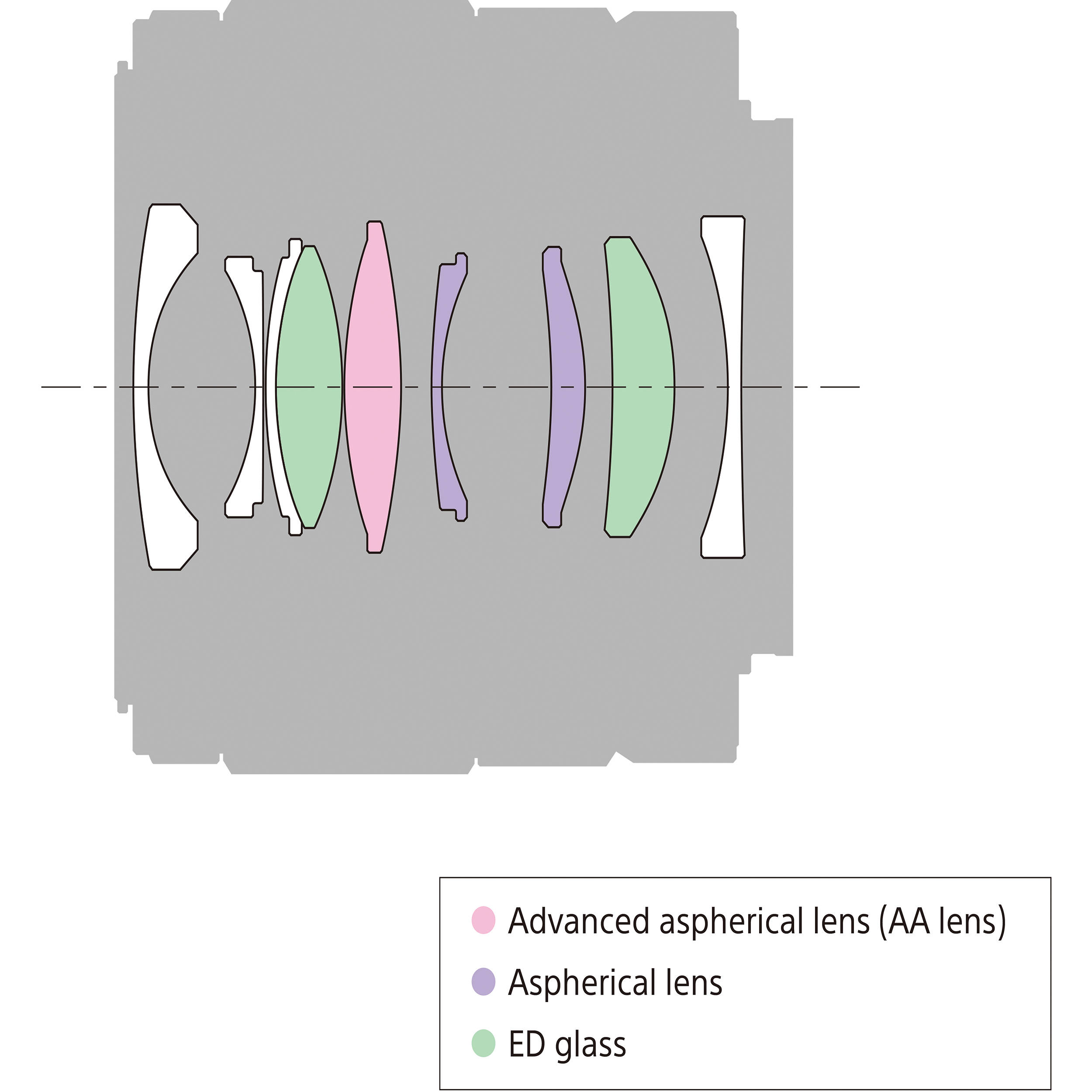 - En el diseño de la lente se incorporan tres elementos asféricos, incluido un elemento Asférico Avanzado (AA), para reducir el astigmatismo, la curvatura del campo, el coma y otras aberraciones monocromáticas.