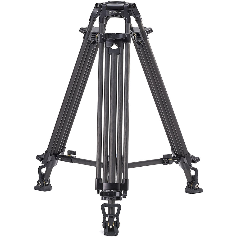 El BCT-2203 Trípode de vídeo profesional de fibra de carbono de 3 secciones de Sirui Cuenta con un recipiente de 75 mm para cabezales fluidos compatibles y soporta cargas de hasta 22 lb. Ofrece un rango de altura de 17 a 63″ y viene con esparcidores de nivel medio y de suelo, los cuales son removibles. El esparcidor de suelo tiene una parte inferior de goma para una colocación más segura en superficies planas. Cuando se retira el esparcidor de suelo, se revelan pies de doble punta para su uso en terreno blando.